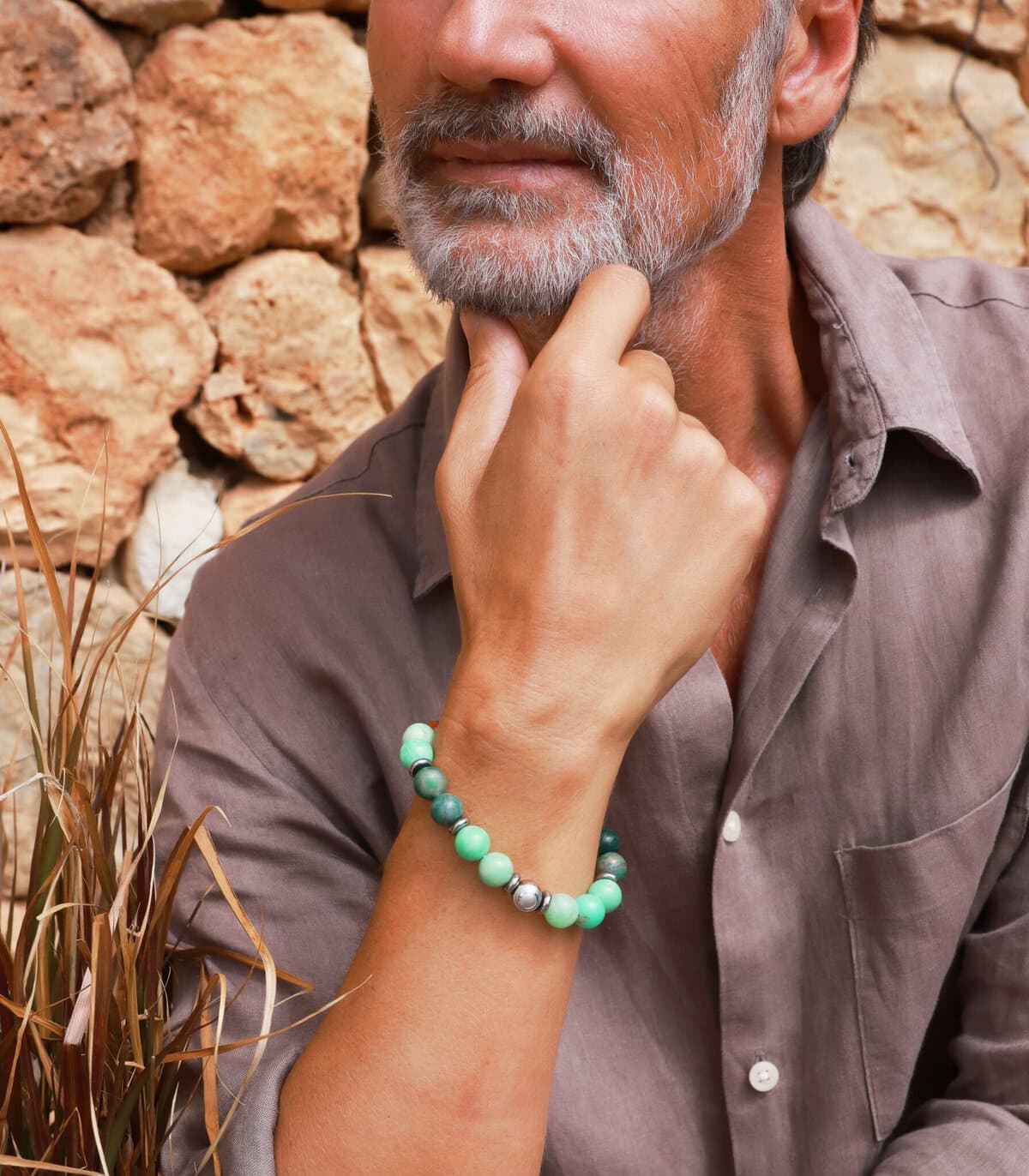 Grün ist nicht nur die Farbe der Hoffnung, sondern im Falle von Good Karma Decision auch die Farbe der Entscheidung. Wer nicht nur in Sachen Style und Auftritt weiß, was er will, sondern auch im Leben gerne das Wesentliche im Auge behält, dem steht dieses elegante Bracelet in jeder Hinsicht ganz hervorragend. Chrysopras, der türkisgrüne Detox-Stein hilft dir, unabhängig von äußerer Bestätigung deinen Weg zu gehen, während der dunkle Fuchsit dir dabei hilft, die Dinge wertfrei so zu sehen, wie sie wirklich sind. So triffst du gute Entscheidungen. Good Karma Pulsstein: Roter Jaspis. Die Abbildung zeigt die Größe 18cm.