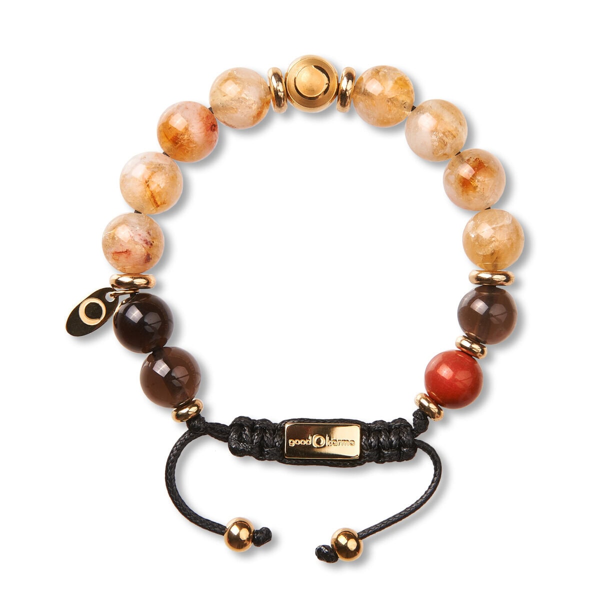 Good Karma Determination ist ein außergewöhnliches Bracelet. Es besteht aus dem seltenen Citrin mit seinen faszinierenden Farbreflexen, die von weiß über goldgelb bis ins rötliche reichen und dem eleganten Rauchquarz, dessen geheimnisvolle Dunkelheit durch seine Transparenz freundliche Leichtigkeit erhält. Citrin ist ein echtes Kraftpaket, er schenkt dynamische Entschlossenheit, lässt optimistisch nach vorne blicken und hilft dabei, selbstbewusst ins Tun zu kommen. Rauchquarz ist dafür bekannt, Belastbarkeit, Resilienz und Willensstärke zu fördern. Er hilft dir, deine Stärke vollständig nutzen zu können und jeder Herausforderung mit einem Lächeln zu begegnen. Good Karma Pulsstein: Roter Jaspis. Die Abbildung zeigt die Größe 16cm.