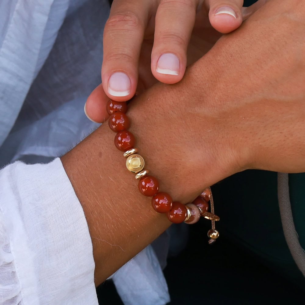 Natürliche Edelsteinperlen im Durchmesser 10mm. Metallteile aus chirurgischem Edelstahl. Goldfarbige Metallteile 18 Karat PVD vergoldet. Kordel aus Hochleistungspolyester.