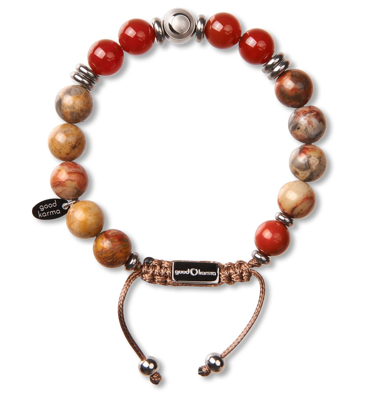 Good Karma Focus Men besteht aus Crazy Lace Achat, dessen erdiges Farbspiel gut mit dem tiefgründigen, karminroten Karneol harmoniert. Es ist das Armband für alle, die ihren scharfen Verstand als ihr wichtigstes Kapital erkennen und ihr inneres Wachstum auf diese Ebene konzentrieren möchten. Ein hellwacher Geist, mentale Beweglichkeit, Präsenz im Hier und Jetzt, fokussierte Konzentration und innere Ausgeglichenheit sind die Energien, die dir diese beiden Edelsteine schenken können. Good Karma Pulsstein: Roter Jaspis. Die Abbildung zeigt die Größe 18cm.