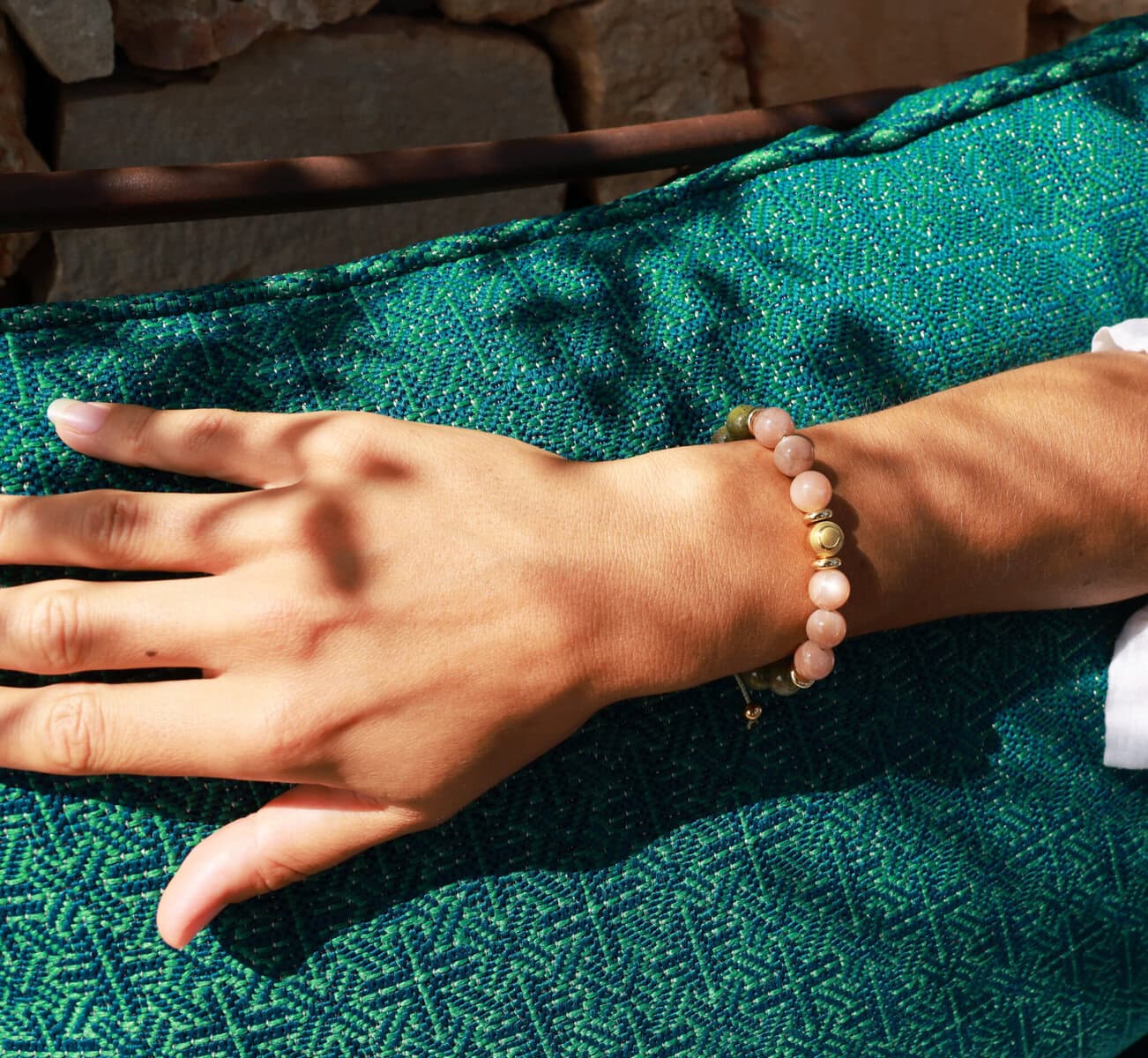 Natürliche Edelsteinperlen im Durchmesser 10mm. Metallteile aus chirurgischem Edelstahl. Goldfarbige Metallteile 18 Karat PVD vergoldet. Kordel aus Hochleistungspolyester.