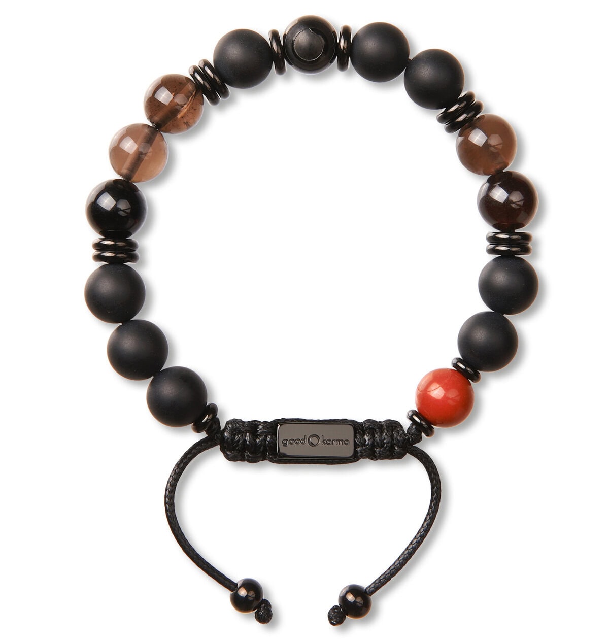 Eleganz ist die Kunst, in Erinnerung zu bleiben, ohne aufzufallen. Genau das ist der Anspruch von Good Karma Smoke, die mit dieser einzigartigen Kombination aus Rauchquarz und Onyx zwei völlig unterschiedliche Interpretationen des klassisch schwarzen Herren-Accessoires verbindet. Good Karma Pulsstein: Roter Jaspis. Die Abbildung zeigt die Größe 18cm.