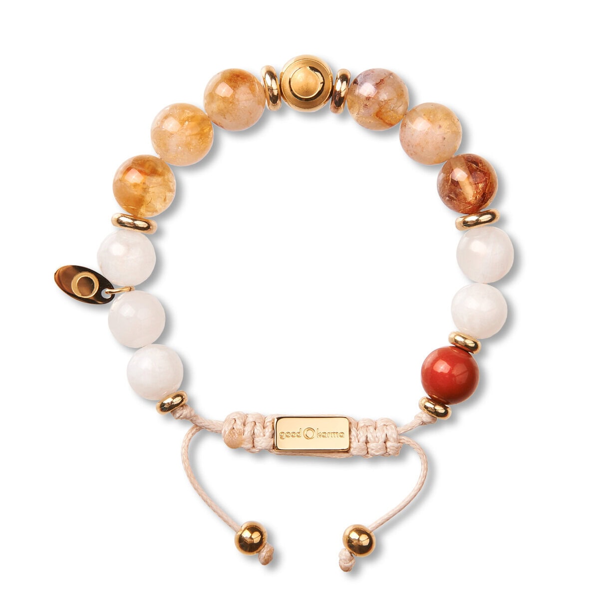 Good Karma Solution besteht aus dem seltenen Citrin mit seinen faszinierenden Farbeflexen, die von weiß über goldgelb bis ins rötliche reichen. Dazu passt der weiß schimmernde Mondstein, der durch Klarheit und Eleganz besticht. Citrin ist ein echtes Powerhouse, er schenkt dynamische Entschlossenheit, lässt optimistisch nach vorne blicken und hilft dabei, selbstbewusst ins Tun zu kommen. Zusammen mit dem Mondstein, der uns immer in unserer Mitte hält, ist diese Kombination genau richtig, um Lösungen für alle Themen des Lebens zu finden. Good Karma Pulsstein: Roter Jaspis. Die Abbildung zeigt die Größe 16cm.